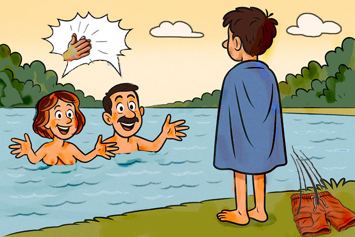 hecha de tela y miedo. Cuando sus padres lo invitan a nadar, ya despojados